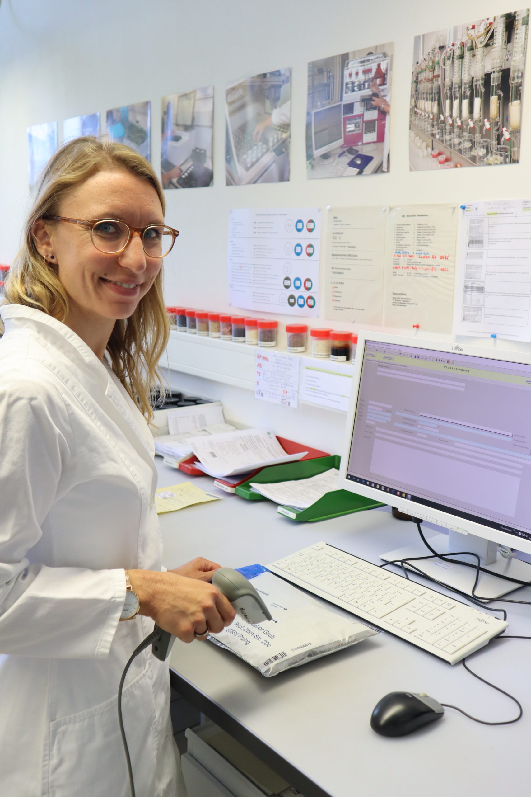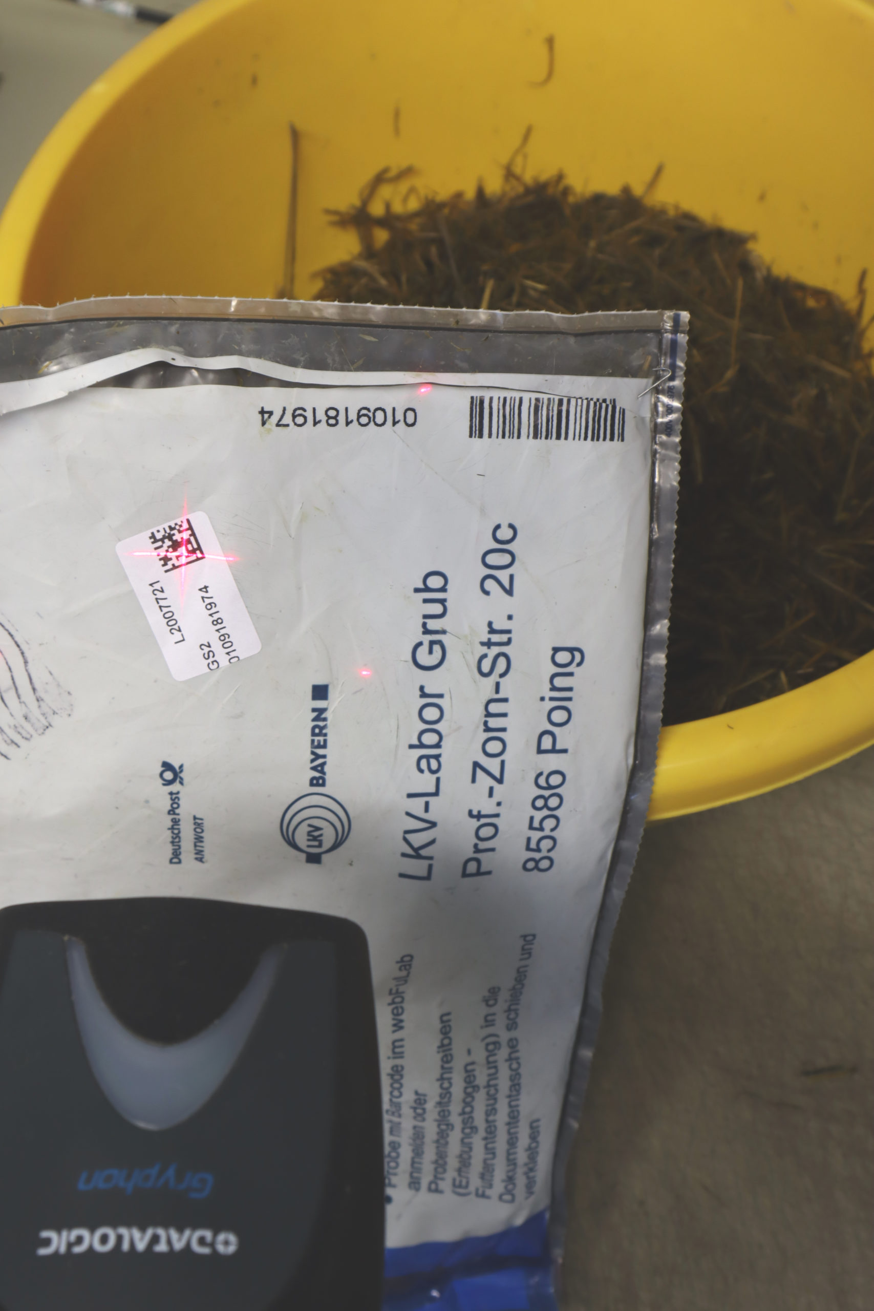 Dort wird anhand des Barcodes sowie optisch und geruchlich als auch anhand des Datums kontrolliert, ob der Inhalt der Probe zum angemeldeten Futtermittel passt und diese frisch ist / dem Anmeldedatum entspricht.