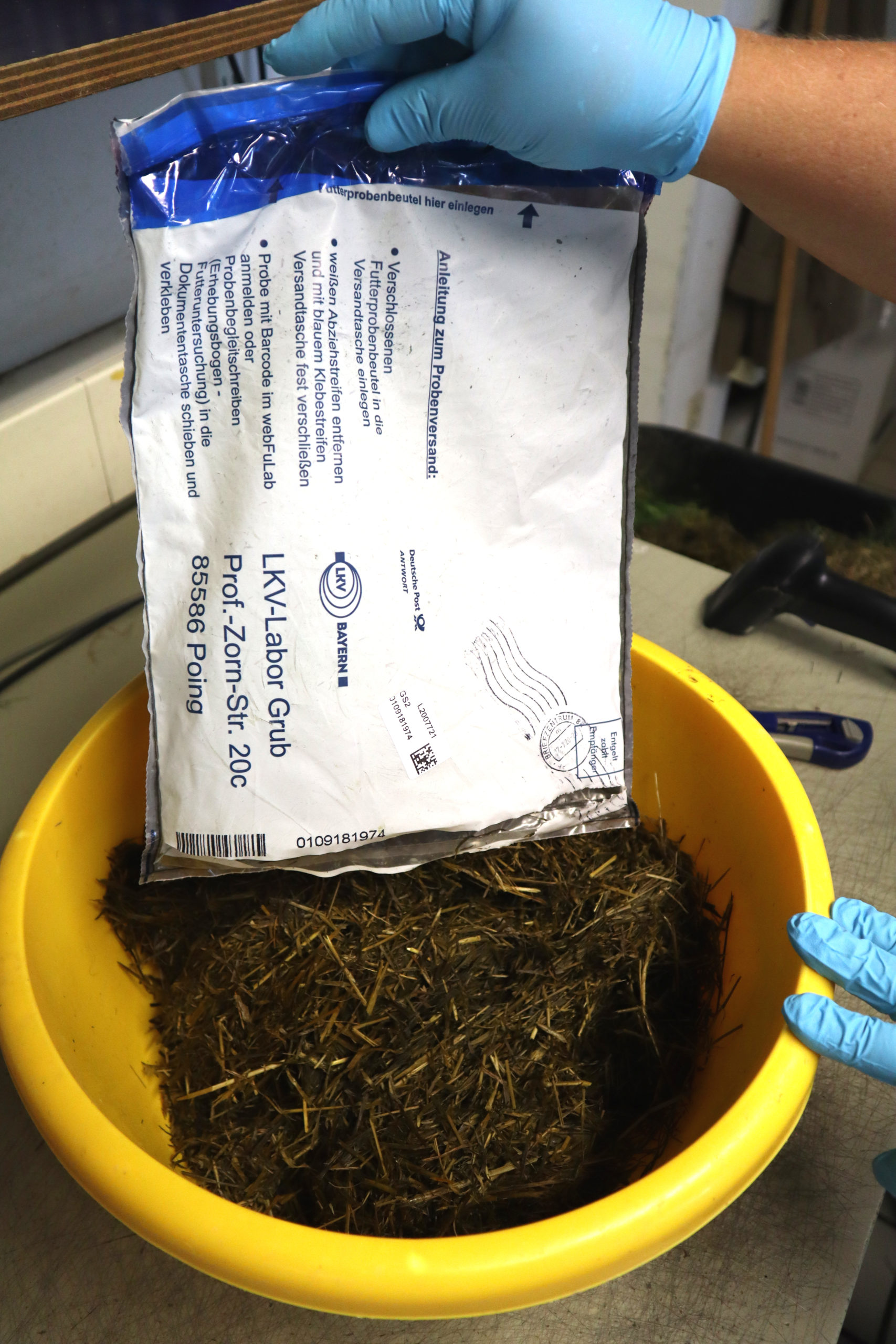 Zur Analyse wird jede Futterprobe einzeln vermahlen, gemischt und in ein sauberes Probengefäß gefüllt.