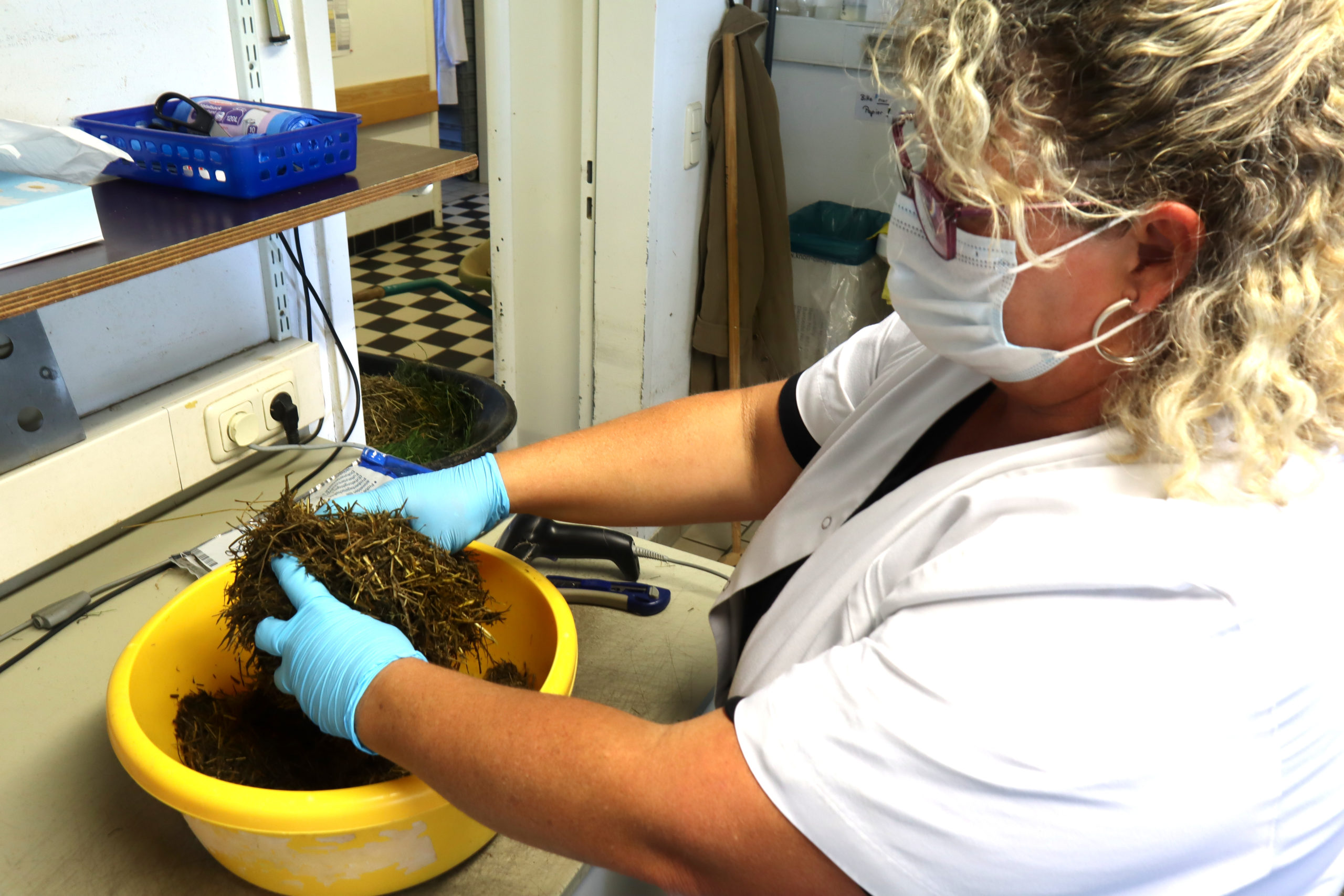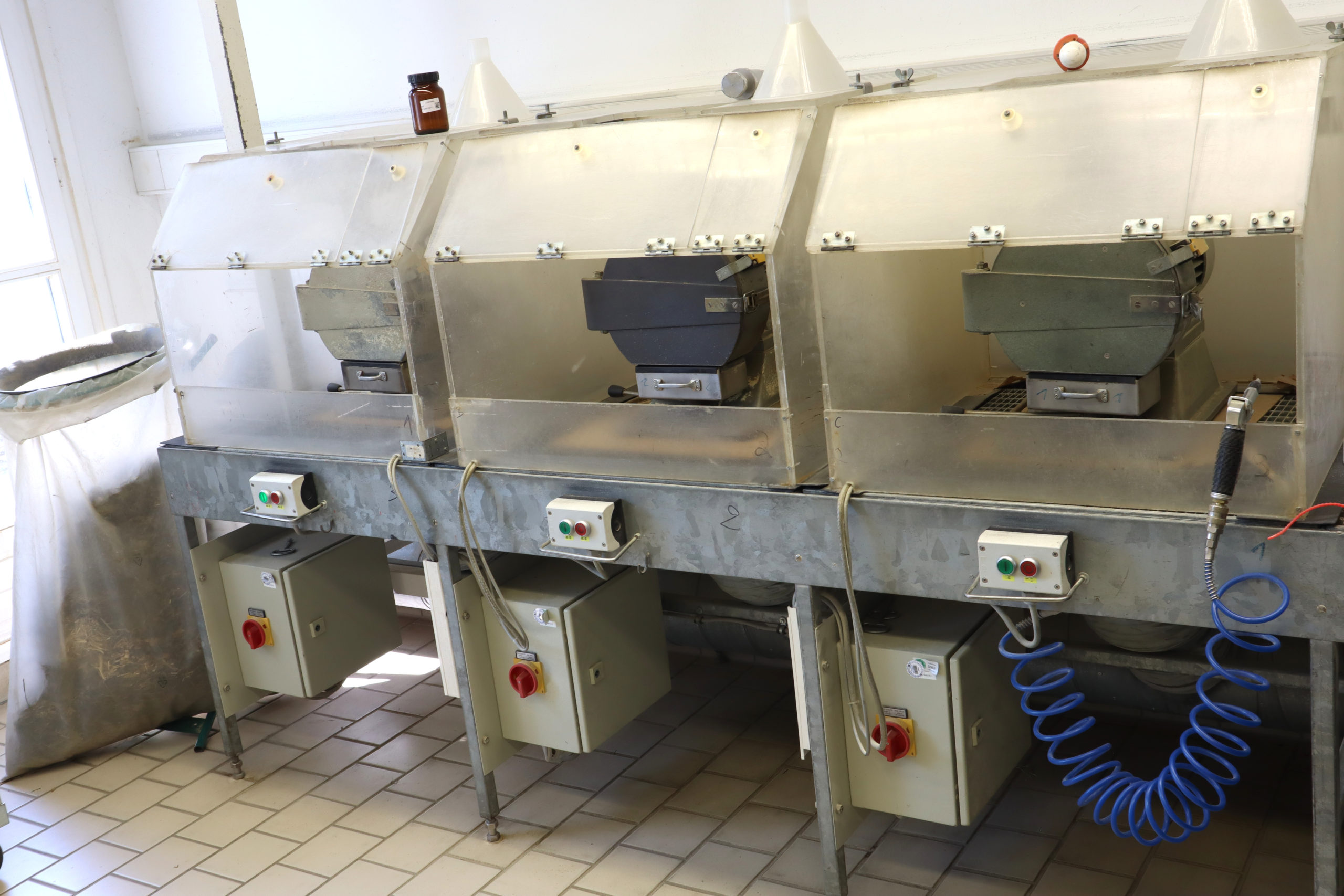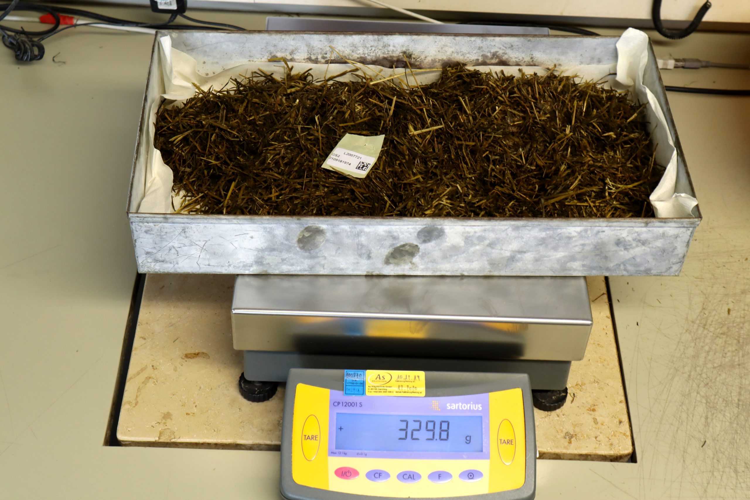 Im Einwiege- und Trocknungsraum werden die geprüften Futterbeutel / Sendungen erneut gescannt, gewogen, vermischt und getrocknet. Postversandtasche und Innentasche werden dazu gemeinsam aufgeschnitten, um die Probe zu entnehmen. Anschließend erhalten sie ein Analyseetikett.