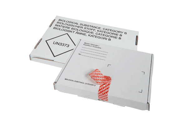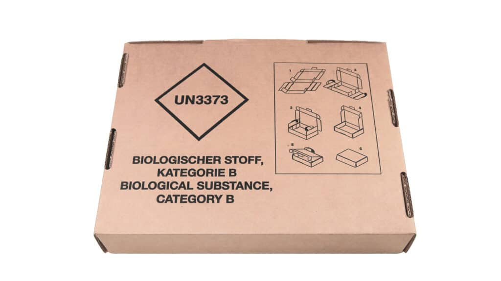 - Zwei Etiketten liegen dem Kit bei – Kennzeichnung für infektiöse Substanzen der Klasse 6.2 und UN3373; diese sind je nach Art der transportierten Probe auf der Umverpackung anzubringen