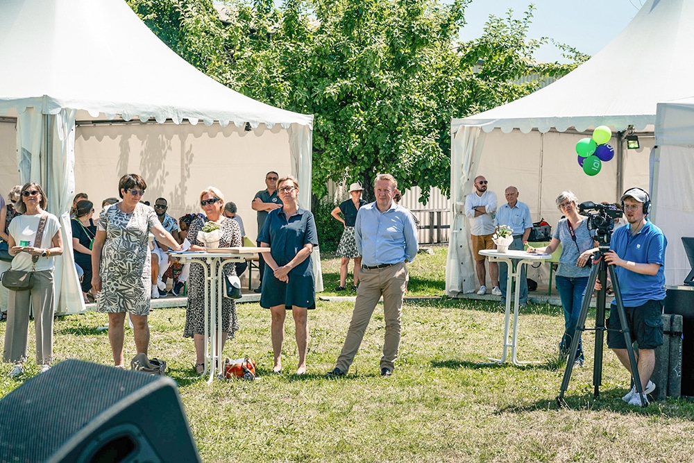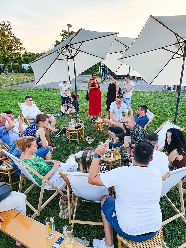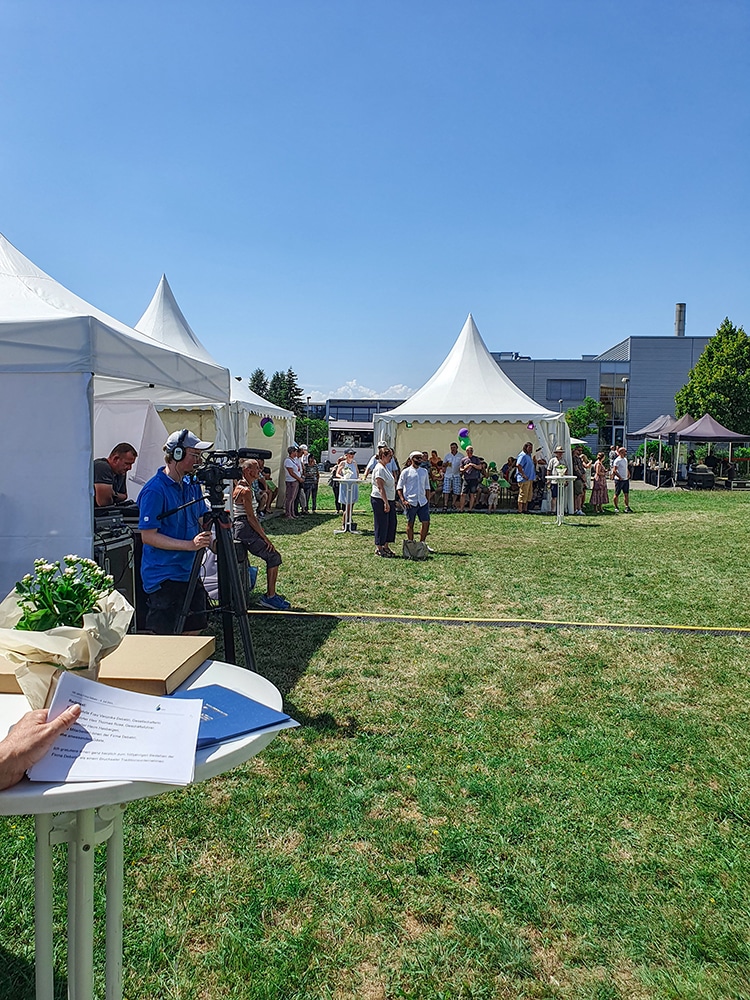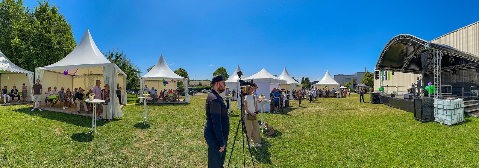 In entspannter Atmosphäre hatten die Feiernden die Gelegenheit, in die Unternehmensgeschichte einzutauchen, sich auszutauschen und es sich gut gehen zu lassen. Für das leibliche Wohl war dabei ebenso gesorgt, wie für Live-Musik, Tanz, Erinnerungsfotos und einen Gang durch die Produktion – oder auch eine kleine Abkühlung am Rande des Rasensprengers 😉