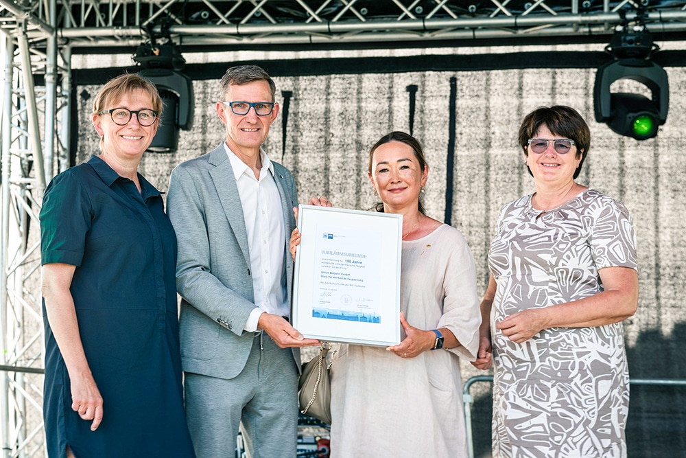 Selbstverständlich durfte auch ein offizieller Teil nicht fehlen, der aber ebenso kurzweilig war wie der Rest des Tages. Während die Reden von Veronika Debatin und Thomas Rose spontan von Zwischenapplausen begleitet wurden, bedankte sich Oberbürgermeisterin Cornelia Petzold-Schick in ihrer Rede für die Standorttreue und das DEBATIN Nachhaltigkeitsengagement, bevor IHK-Referentin Linda Jeromin das Überreichen der Jubiläums-Urkunde übernahm und die enge Zusammenarbeit zwischen DEBATIN und der IHK Karlsruhe hervorhob.