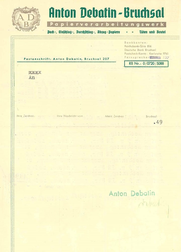 Vermutlich Gründe, weshalb sich Anton Debatin, nach den Anfangsjahren und mit der Gründung von Anton Debatin Bruchsal 1935, für eine Art Wappen entscheidet, welches für das Unternehmen steht und z. B. auf Briefpapier abgebildet wird. Das Original des ADB-Wappens, damals Teil der Fensterverglasung in einem Büro in der Schnabel-Henning-Str. 34 in Bruchsal, ist noch heute erhalten.