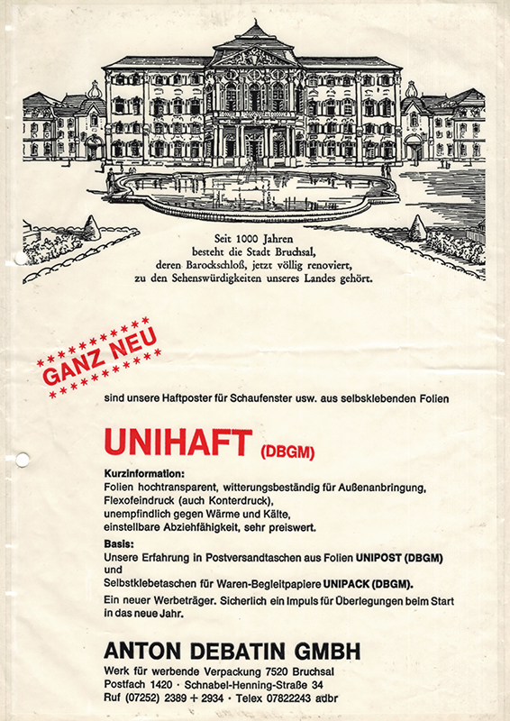 Mit der Erweiterung der Kompetenzen im Bereich Folien und Produktneuentwicklungen, wie selbstklebenden Versand- und Lieferscheintaschen für die Deutsche Bahn, kann DEBATIN sich schon früh einen Namen als Spezialist im Bereich Verpackung und Folien machen. Entwicklungen, die sich auch in Claims und Imagebroschüren widerspiegeln.