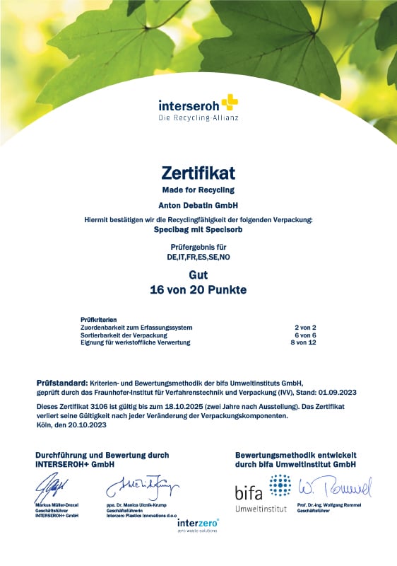 Dass unsere Verpackungslösung DEBAMED® Speci-Sorb aber nicht nur ausgesprochen intelligent, sondern dazu auch noch nachhaltig ist, bestätigte uns jetzt die Recycling-Allianz interzero. Von ihr erhielten wir für DEBAMED® Speci-Sorb das Zertifikat „Made for Recycling“. Wir haben 16 von 20 Punkten erreicht und die Bewertung „Gut“ erhalten. Und auch unsere Specibags ohne Speci-Sorb sind nun mit diesem Zertifikat (18 von 20 Punkten) ausgestattet. Die bifa Umweltinstitut GmbH hat die Bewertungsmethodik entwickelt und das Fraunhofer-Institut für Verfahrenstechnik und Verpackung hat sie überprüft. Da können nicht nur wir uns freuen, sondern auch unsere (potenziellen) Labor-Kunden. Allein 40 % der deutschen Labore stufen die Bedeutung von Nachhaltigkeit immerhin als hoch bis sehr hoch ein!